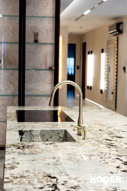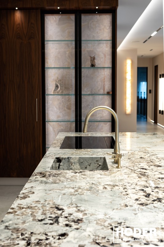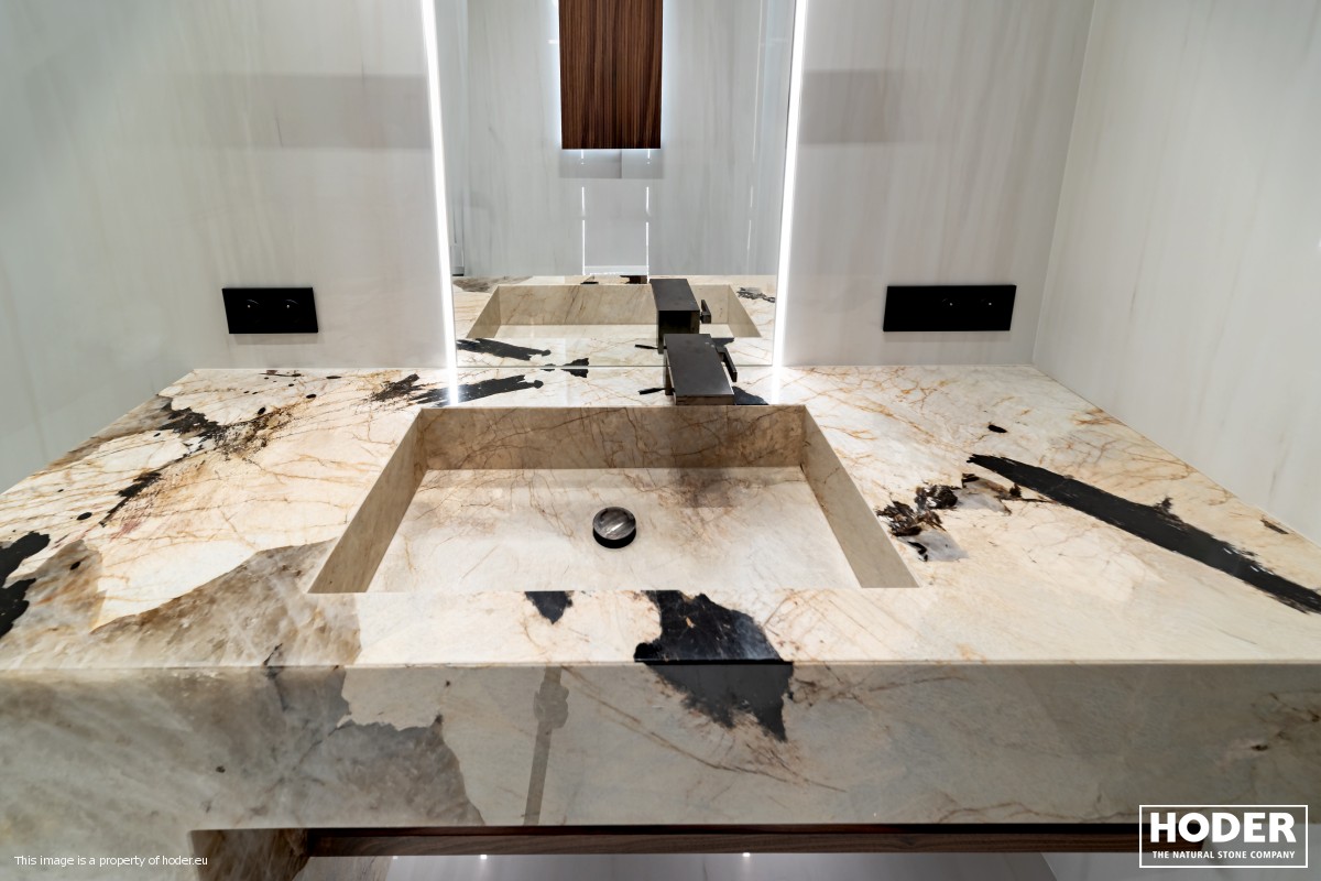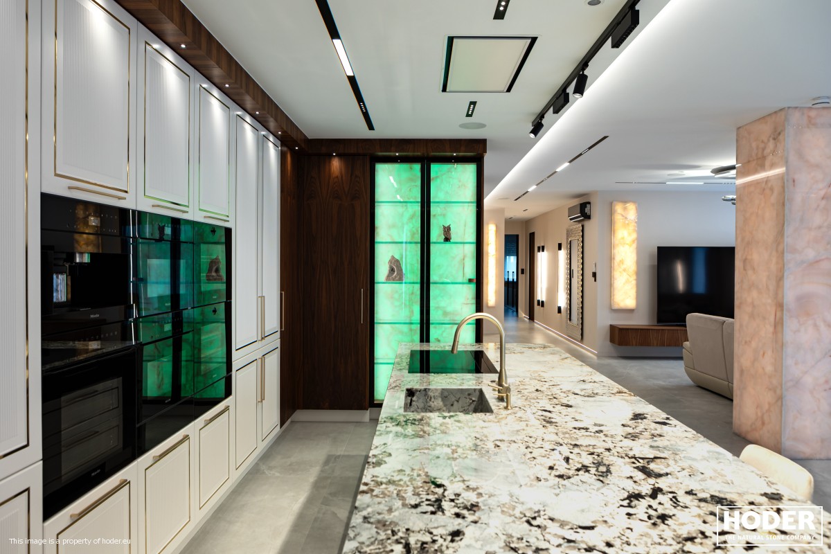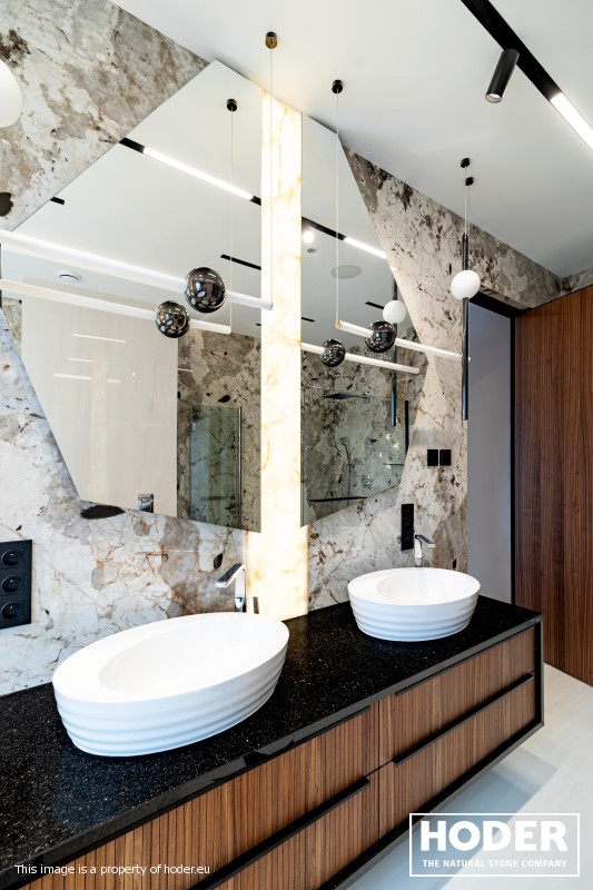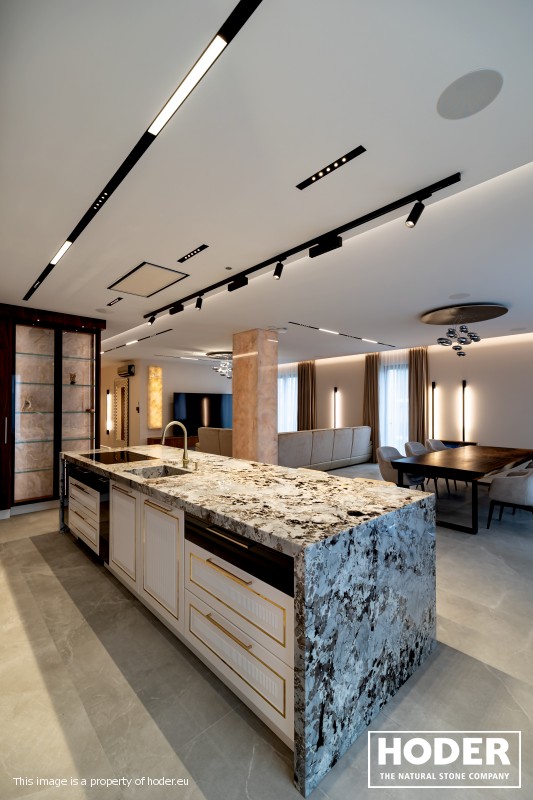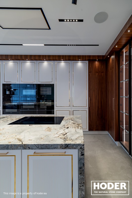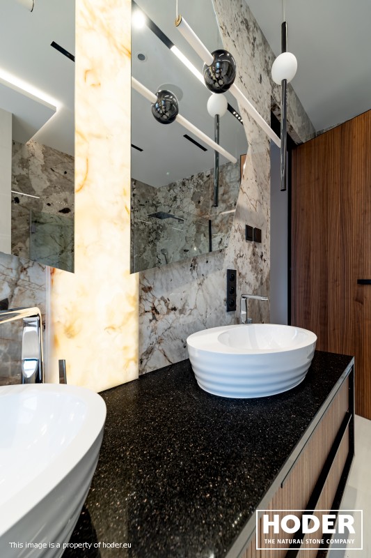 KÜCHENARBEITSPLATTE aus Granite 712, Waschtischplaten aus Granite 37 and natürlichem Quarzit 442 und Innenräume onyks 128